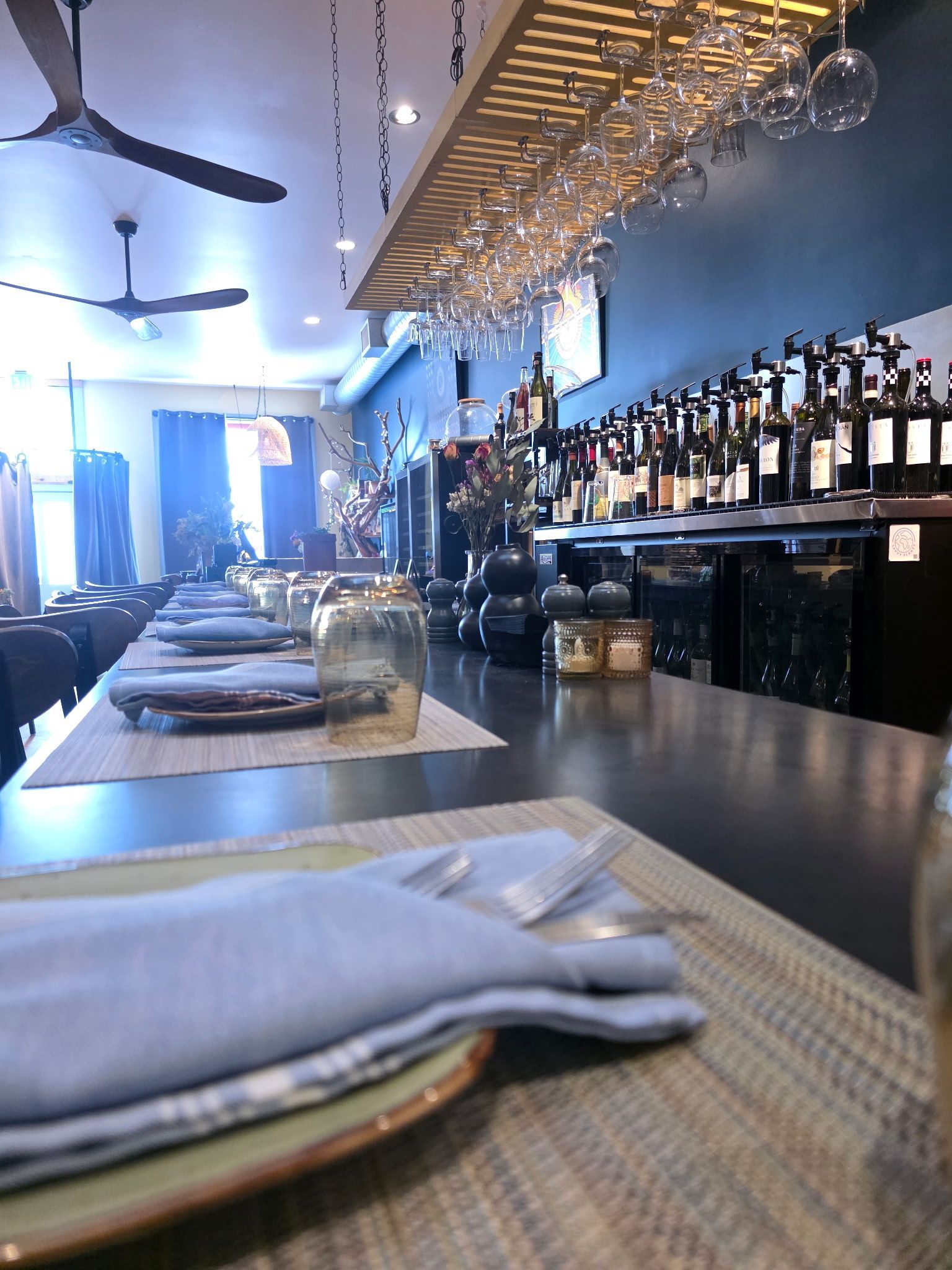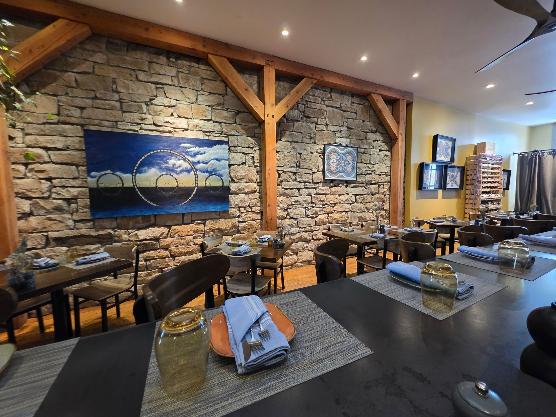 Our space features exposed stone walls, warm wooden beams, and original art that captures the spirit of Colorado. It’s a place where you can have an intimate date night, a lively catch-up with friends, or even a solo afternoon with a book and a flight of wine. We’ve worked hard to create a cozy lounge that feels like your coolest friend’s living room (if your friend happened to have 36 wines on tap and a professional-grade kitchen).